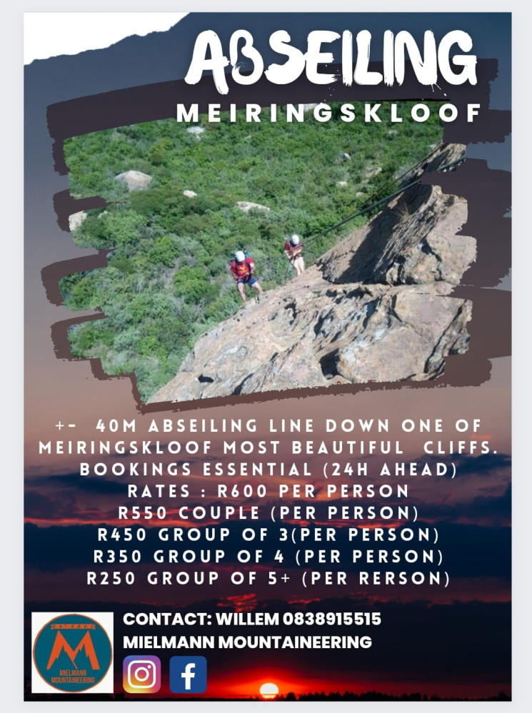 Book Directly with:Willem 083 891 5515Come and enjoy an adventure down one of Meiringskloof’s beautifull cliffs, bring friends and family - the more the merrier &cheaperBook 24 hours ahead of time!!!Guests staying in Meiringskloof only pay absailing rates; outside guests pay an extra entrance fee of R25/adult and R25/child and still get to spend the rest of the day swimming or doing our hiking trails.